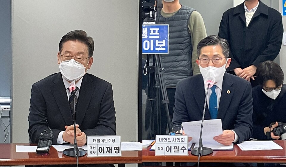더불어민주당 이재명 대선후보와 코로나19위기대응특별위원회 관계자들이 28일 오후 의협 용산임시회관을 찾아 대한의사협회(이하 의협)와 함께 코로나19 위기상황 및 오미크론 변이 확산 사태와 관련해 논의했다.